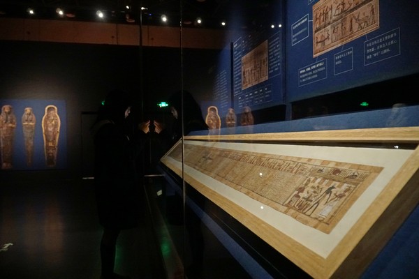 对于公众而言,古埃及的金字塔、狮身人面像、木乃伊等可谓家喻户晓。此次特展,作为古埃及文明标志性的文物木乃伊、亡灵书以及小金字塔、狮身人面像等都将首次降临广州。在展览第二部分“探寻永生”中,丰富的文物与场景还原设计相结合,为观众呈现了古埃及人独特的丧葬习俗。古埃及人不畏死亡,因为他们相信还有来世,死亡不过是另一段旅程的开始,于是他们精心地打造墓室、保存好逝者的躯体、准备各种陪葬品,以期帮助逝者顺利通过层层障碍,安然前往他们心目中的永恒世界——“芦苇之野”。本次展览不仅为观众带来了彩绘丰富的人形棺、保存完好的木乃伊以及众多独具趣味的葬礼用品,还为观众呈现了一组完整而清晰的古埃及墓室壁画。
