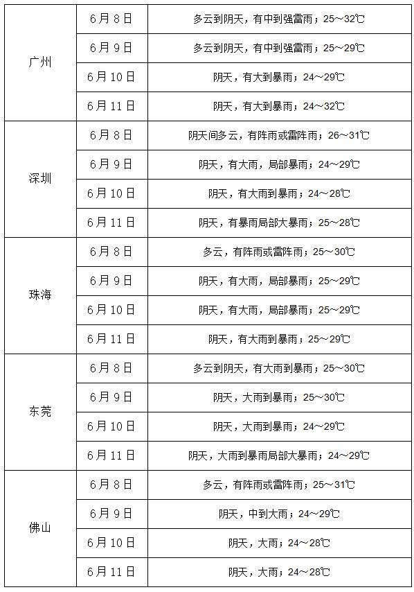 10日,粤西、珠江三角洲、粤东市县有大雨到暴雨局部大暴雨,其余市县有中到大雨局部暴雨。
